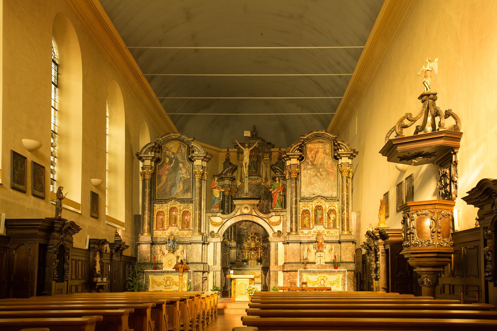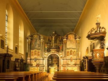 The church of Troisvierges was first mentioned in 1489. At that time it was a chapel where the three young women Fides, Spes and Caritas were revered. In 1630 Franciscan monks began building a monastery, which was later extended to a church. In 1653, new walls were built around the old chapel, which remained until the completion of the church in 1658. Today the church is one of the most important historical buildings of the locality. It was built in Baroque style and houses one of the oldest organs in the country, as well as Rubens paintings and statues of the 3 virgins, "trois vierges" in French, which gave the city its name.